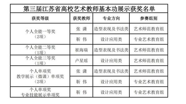 近日,第三届江苏省高校艺术教师基本功展示结果揭晓,公司4位参赛教师凭借深厚的专业功底与出色表现,一举揽获7项奖项,包括个人全能一等奖2项、二等奖1项、三等奖1项,以及教学展示(微课)单项奖2项、专业技能展示单项奖1项,创历史最好成绩。同时,公司以省艺术师范美术教育团体第三名的身份,首次晋级全国高校音乐美术教育专业教师基本功展示,实现历史性突破。