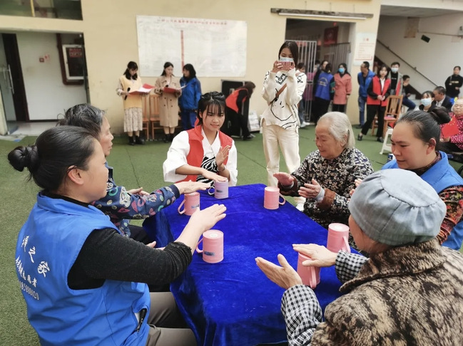 初抵养老中心,随即卸下行囊走进老人的日常。或是围坐檐下,听老人细数岁月里的故事,让泛黄的记忆在交谈中重新鲜活;或是轻擦窗台、整理衣装,用指尖的细致拂去生活的尘埃。那些细碎的互动如涓涓细流,渐渐漫过老人的眉眼,让久违的笑容在脸庞绽放。文艺演出时,成员们的歌声清亮、舞姿轻快,将欢声笑语装满整个活动室;手工课上,老人握着剪刀缓缓裁剪,虽动作稍缓,眼神却满是专注,红纸在指尖慢慢化作精巧的纹样;血压测量环节,成员们俯身为老人缠上袖带,轻声叮嘱饮食注意事项,温柔的关怀让老人频频颔首,眼中满是认可。