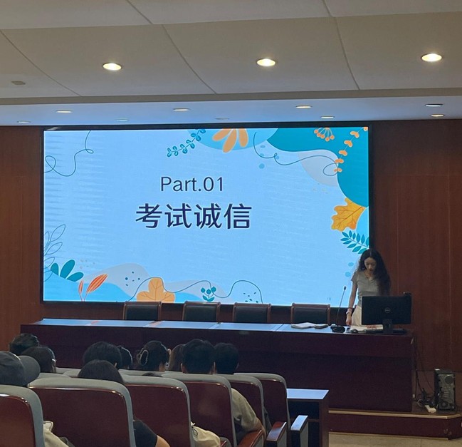 班会中,戴老师首先强调了考试诚信的重要性,呼吁同学们端正态度、严守考纪,共同维护公平公正的考试环境。随后,她就请假销假流程、作业收发规范等日常教学管理事项进行了详细说明,提醒同学们严格遵守公司制度。在网络安全部分,戴老师结合典型案例,分析了网络诈骗的常见形式与防范措施,并再次强调个人信息保护的重要性。此外,她还对宿舍安全用电、晚归报备制度、出行安全和季节性疾病预防等贴近同员工活的实际问题进行了细致讲解,帮助大家识别风险、增强防范意识。
