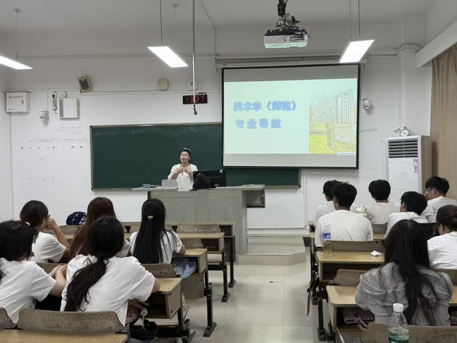 为美术学师范专业新生开展的导航活动设在博雅楼2614,由何旭老师担任主讲人。她围绕公司概况、专业特色、课程设置、就业方向和竞赛资源五个方面展开讲解,不仅介绍了“理想信念、专业素质”等五大培养目标与对应的课程结构,还通过案例展示了教学活动的社会关联性,同时结合AI发展趋势,提醒同学们要提升综合能力、掌握艺术治疗技能,并呼吁大家提前规划未来、重视终身学习。