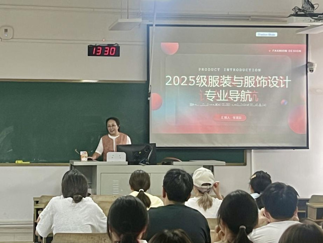 服装与服饰设计专业的导航活动由郎家丽教授与张堇辰老师共同主持。张堇辰老师先梳理了专业发展脉络与融合培养模式,介绍了专业优势和7个实训场所,接着解读了“基础-核心-拓展”课程体系与四年培养路径并展示了专业荣誉。最后,郎家丽教授对新生提出殷切期望,希望大家转变心态,提升自我管理与协作能力,扎实掌握专业知识技能。